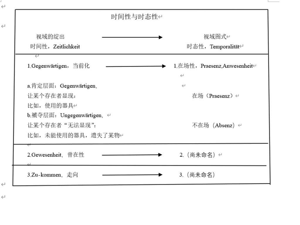 首先我们先看第一重。从一般存在的视域出发,如何对此在的这个三维绽出进行规定的呢?在这里面,海德格尔其实是借助了康德的时间图型说,他这里强调来自一般存在的一个视域的Schema。视域的图式事先就已经规定了此在绽出的一个基本方向,他把这个叫作一般存在的时态性(Temporalität)。