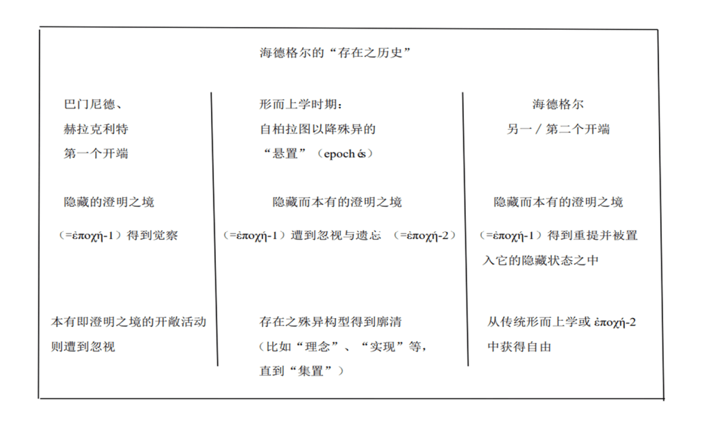 海德格尔为了更好地说明如何从存在自身出发来去解释相关的这个存在和时间的问题,他还特别强调了——在阿那克西曼德箴言里面——存在自身有一种自行抑制的本性,存在自身向来有一种自行的抑制和自行本然的隐藏。所以这个es不能做任何实体化的在场性的解释。海德格尔也把这样的一个自行的抑制称之为某种悬置,当然这个悬置不是在胡塞尔的意义上所讲的关于某种意识活动的一种终止,海德格尔做了新的一个理解,即称之为存在的悬置。存在自身不完全是一种派送、一种显现,存在还有就是自行隐藏的一面。所以从这一点来看,形而上学传统对于存在的遗忘,其实并不是某个哲学家或是诸哲学家本人的疏忽或过错,其实是存在自身自行抑制的一个必然结果,就是存在自身的发生必然蕴含着遗忘存在,所以从这一点来看,存在之遗忘,恰恰是存在自身所派送的一个天命,就是存在之天命(Geschick)。海德格尔使用了许多语词的游戏,Geschick和schicken有一种对应关系。海德格尔想表达的就是对存在的遗忘,不是柏拉图或者亚里士多德遗忘的存在、自己遗忘了存在,或者是有意遗忘。在后期海德格尔看来,就是因为存在自身的一个自行的派送,同时蕴含着自行的抑制或者自行本然的隐藏。所以在这个意义上而言,它的发生总是澄明着、遮蔽着的一个双重的发生,是显隐二重性所共属的发生。在这个意义上存在的遗忘也是存在的天命。所以海德格尔强调我们恰恰要根据对存在遗忘的状态的经验来运思这种存在的悬置,因为我们知道这个悬置到后来还演变成了带有时间特征的时代(epoch)一词,因此,在海德格尔后期看来,“存在之时代本质(das epochale Wesen)居有着此之在的绽出本质(das ekstatische Wesen)”。存在的本质本身蕴含了源始的时间,这个源始的时间就是如何兹有的那个时间,而这样一个时间往外,才能够进一步居有此之在的绽出本质。在这里面海德格尔后期进一步回答了前期没有解释的问题,就是此之在绽出的开端来自于哪里,即来自于存在自身的这样的一个悬置。